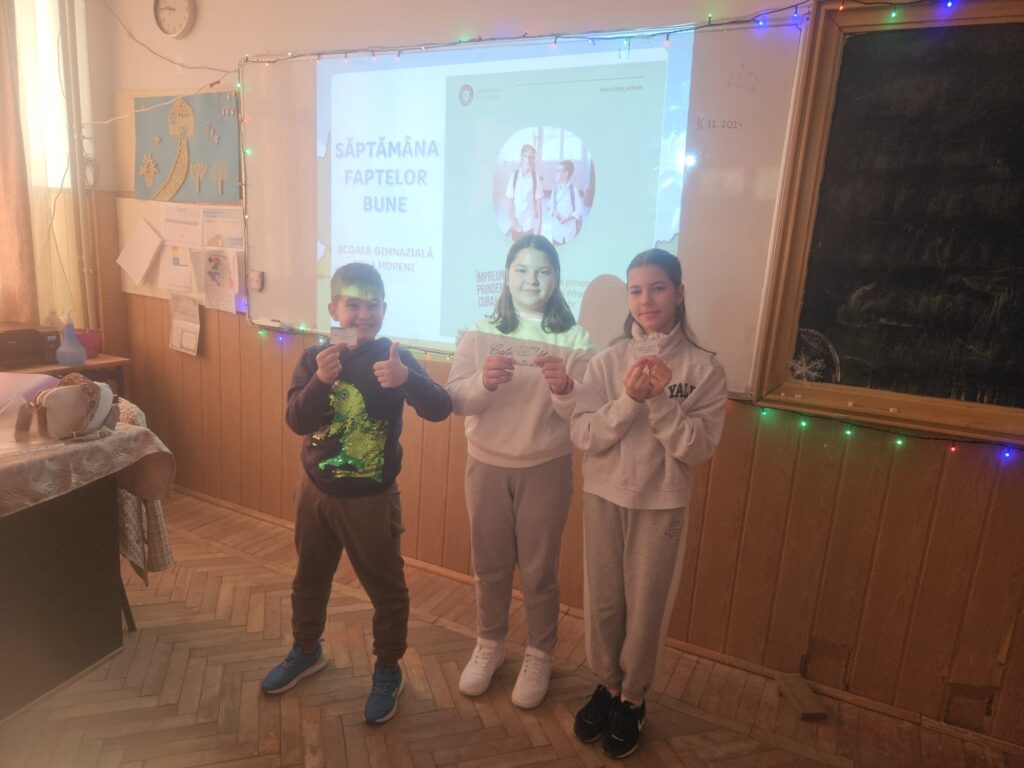 „Săptămâna faptelor bune” derulată la Școala Gimnazială Nr. 1 Moreni, avându-i protagoniști și pe elevii claselor a VII-a A și a V-a A s-a încheiat cu jocuri și creații de echipă, momente de relaxare, precum și cu împărtășirea de emoții și experiențe pozitive trăite. Cu siguranță vom relua această inițiativă și în anul 2025 pentru a continua promovarea faptelor de bunătate în școală și în comunitate.